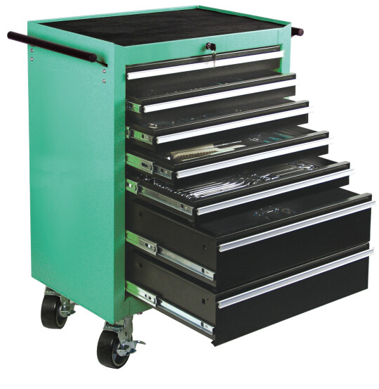 Semiprofessionele gereedschapwagen, 321-delig gevuld. Gemaakt van solide plaatstaal, groen gepoedercoat, met 7 afsluitbare hoog belastbare laden met uittrekstop en kogelgelagerde geleiders en een werkblad met antislip oppervalk. De kar is verrijdbaar (2 bok- en 2 zwenkwielen met blokkering).